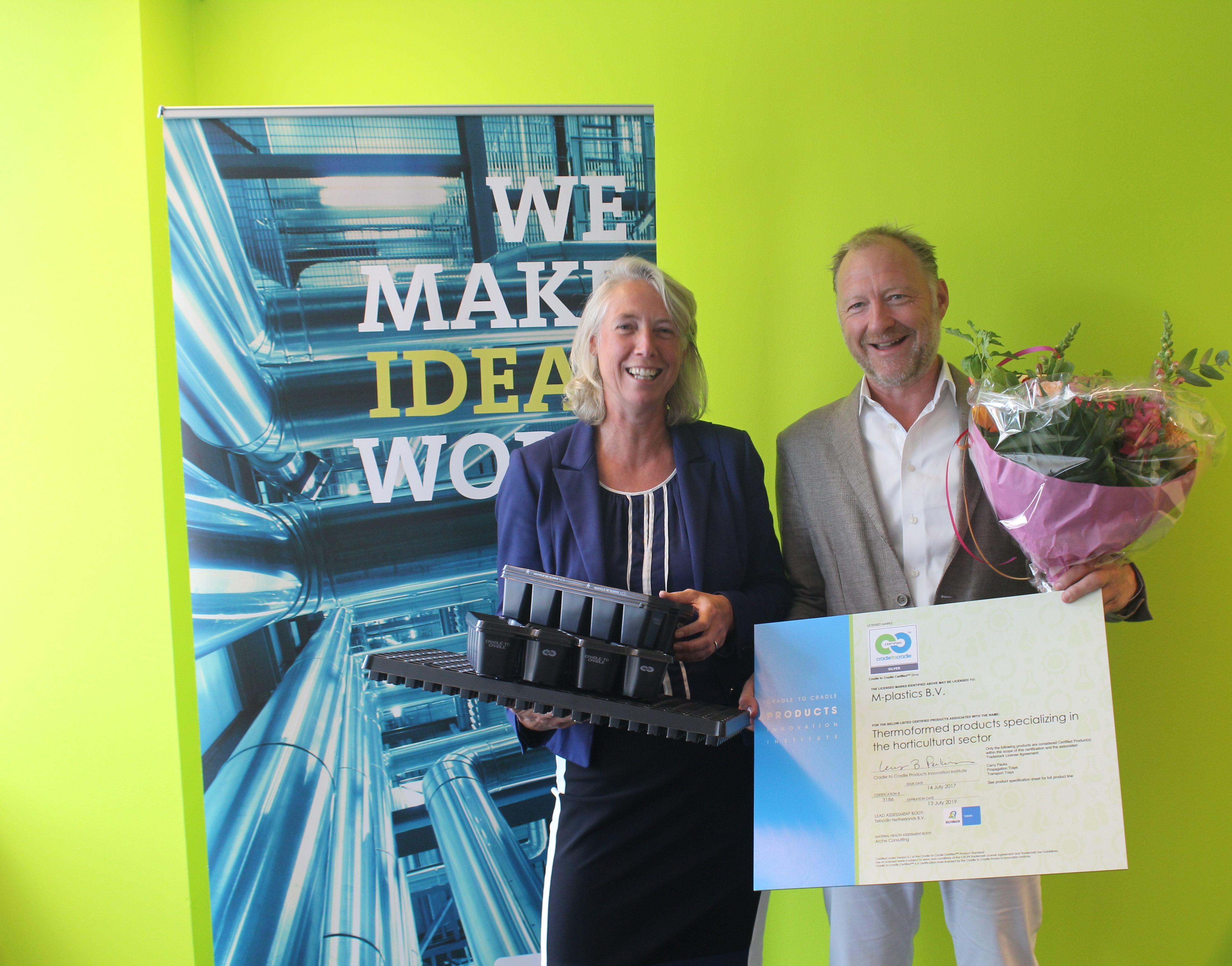 M-plastics heeft als allereerste in de agri- en sierteeltbranche een Cradle to Cradle certificering voor zijn verpakkingsproducten behaald. Paul Schildmeijer, directeur van het Nederlandse bedrijf in kunststofverpakkingen voor de landbouw en sierteelt: "Met de Cradle to Cradle certificering op Zilver niveau hebben we een belangrijke stap gezet in de duurzame verandering van M-plastics, dat al CO2 neutraal is. We willen voorop lopen op gebied van Maatschappelijk Verantwoord Ondernemen en laten zo aan onze klanten zien dat het productieproces voor onze verpakkingsproducten volledig duurzaam en milieubewust is ingericht."